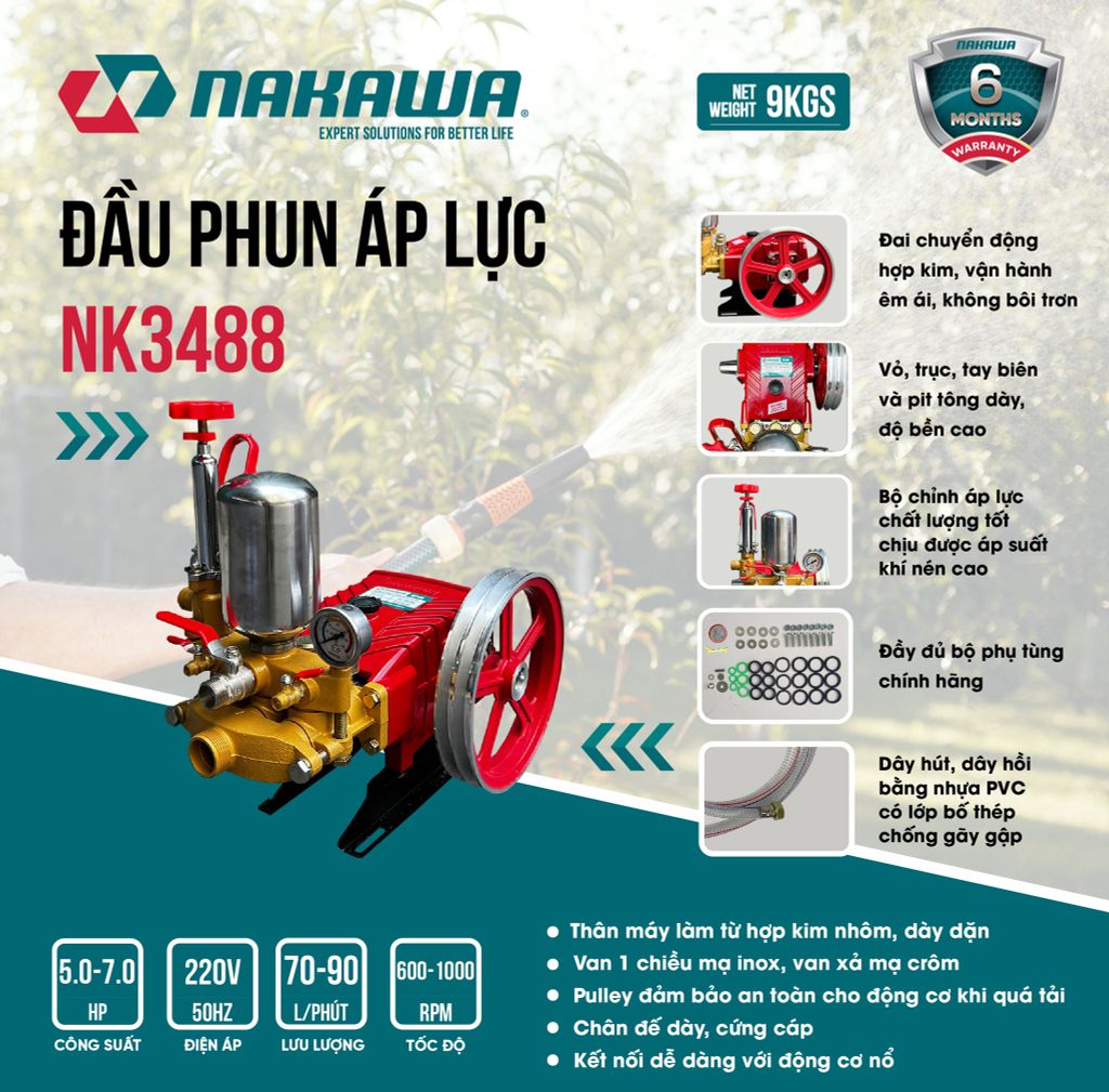Đầu phun áp lực Nakawa NK3488 là sản phẩm mới của thương hiệu Nakawa được sản xuất theo công nghệ Nhật Bản. Máy có hiệu suất làm việc mạnh mẽ hơn và áp lực nước lớn hơn. Giúp bạn dễ dàng xử lý mọi vết bám bẩn trên xe hoặc tường, sân, vườn, v.v. Sản phẩm có nhiều ưu điểm và tính năng vượt trội, mang lại nhiều lợi ích và tiện lợi khi sử dụng.