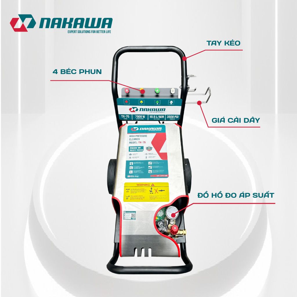 Máy phun áp lực cao công nghiệp Nakawa TX-75 với công suất lên đến 7500W, áp lực tối đa là 3500PSI, máy có thể dễ dàng đánh bay mọi vết bẩn, vệ sinh xe máy, ô tô, hồ bơi, làm sạch sân vườn, các thiệt bị máy móc,... một cách nhanh chóng, giúp người dùng tiết kiệm công sức và thời gian hiệu quả.