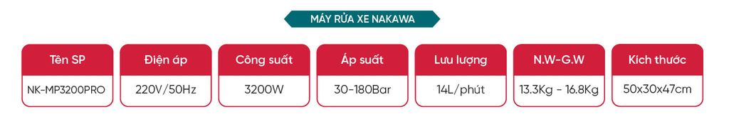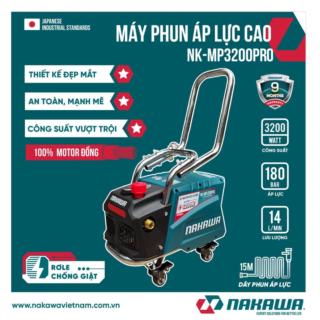 Máy phun áp lực cao NAKAWA NK-MP3200PRO hay còn gọi là máy rửa xe áp lực cao được sản xuất theo tiêu chuẩn chất lượng Nhật Bản, với thiết kế tính năng vượt trội so với các dòng máy rửa xe xách tay thông thường. Máy được dùng để rửa xe máy, xe ô tô, xịt rửa sân vườn, phun tưới cây cối hoặc vệ sinh điều hoà...1. THÔNG SỐ KỸ THUẬT CỦA MÁY PHUN ÁP LỰC NAKAWA NK-MP3200PRO